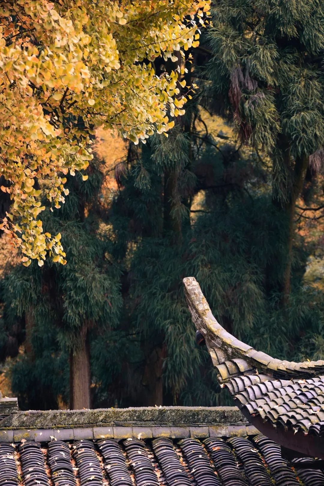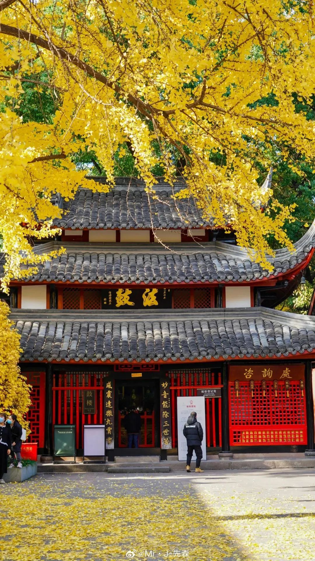 看最美银杏,位于闹市中的文殊院是不可错过之地。不久后,寺内“文殊阁”片区大片的银杏全黄且铺地,美得令人心旷神怡~