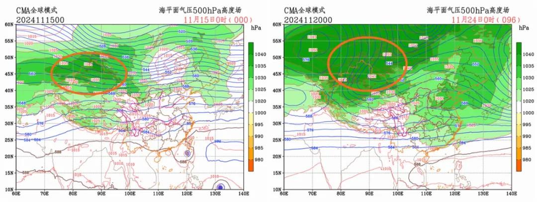 △上次强冷空气过程冷高压中心强度最强时是1040百帕,这次过程最强可能达到1055百帕。