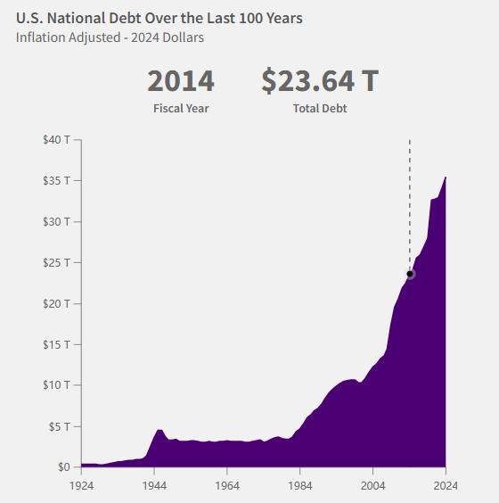 △美国财政部下属的财务数据网站披露的数据显示,美国国债总额从2014年的23.64万亿美元升至2024年的超36万亿美元,涨幅超52%,这一趋势整体上仍在持续加快。