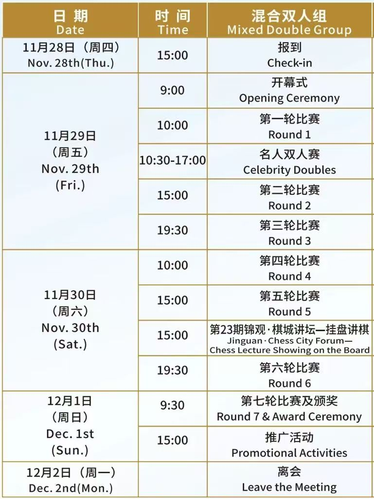 本届比赛日期为11月29日至12月1日,为期三天。赛事将在腾讯棋牌·天天象棋、抖音、快手、B站、虎牙、YY直播等平台全程直播,世界象棋联合会副秘书长、欧洲象棋联合会第一副主席兼副秘书长薛忠,四川象棋队总教练、国家大师蒋全胜,国家大师时凤兰、林延秋,将作为嘉宾为棋迷朋友进行线上和线下讲棋。