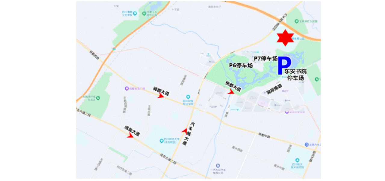 4.湖岸北路沿线停车场(P6、P7):由成都方向自驾前往,建议经三环航天立交→驿都大道→汽车城大道→湖岸北路抵达停车场,或经渝蓉高速龙泉驿出口→汽车城大道→湖岸北路抵达停车场。