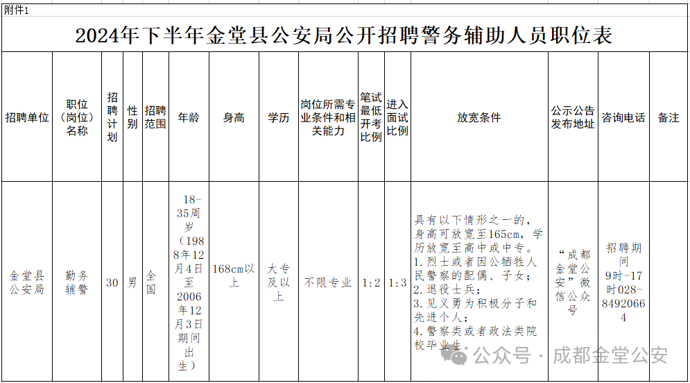 此次共计划招聘30名辅警,限男性。具体职位、名额、资格条件等详见附件1《2024年下半年金堂公安局公开招聘警务辅助人员职位表》(以下简称《职位表》)。