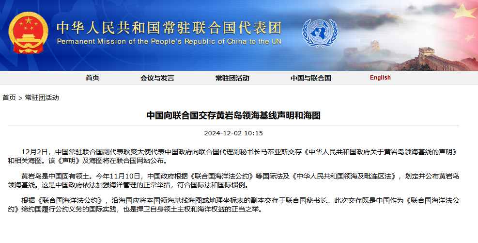 当地时间12月2日,中国常驻联合国副代表耿爽大使代表中国政府向联合国代理副秘书长马蒂亚斯交存《中华人民共和国政府关于黄岩岛领海基线的声明》和相关海图。该《声明》及海图将在联合国网站公布。