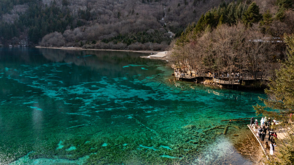 12月6日,游客在九寨沟景区的五花海游览(无人机照片)。新华社记者沈伯韩 摄