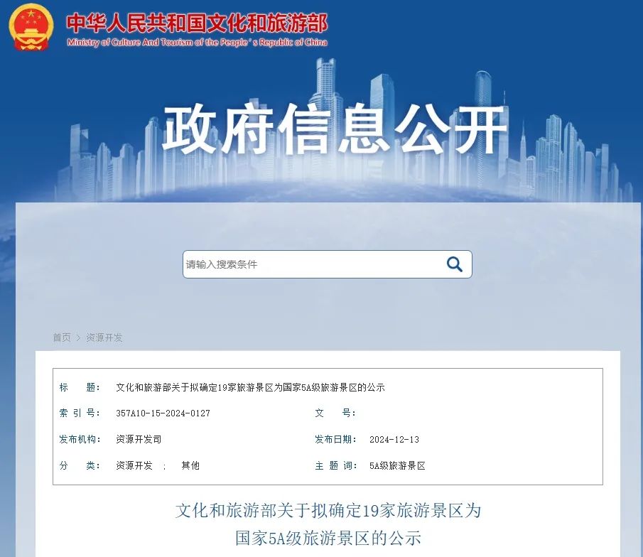 根据中华人民共和国国家标准《旅游景区质量等级的划分与评定》和《旅游景区质量等级管理办法》,经有关省(区、市)文化和旅游行政部门推荐,文化和旅游部按程序组织综合评定,以下19家旅游景区达到国家5A级旅游景区标准要求,拟确定为国家5A级旅游景区,现予以公示。名单如下:
