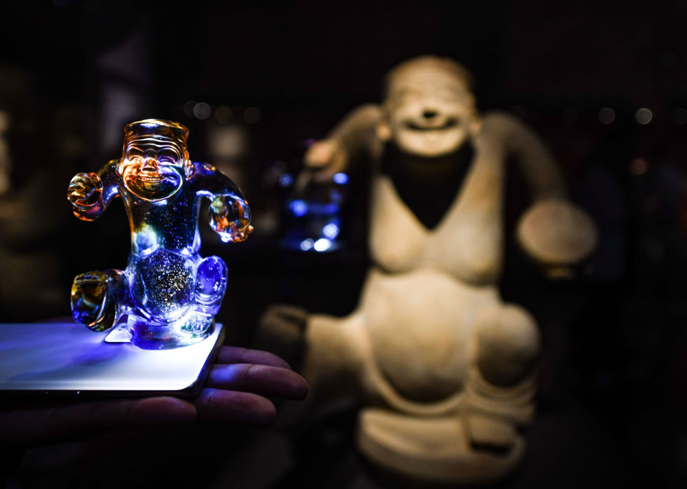 成都博物馆的汉代陶说唱俑和其文创产品(左)。记者 王曦 摄