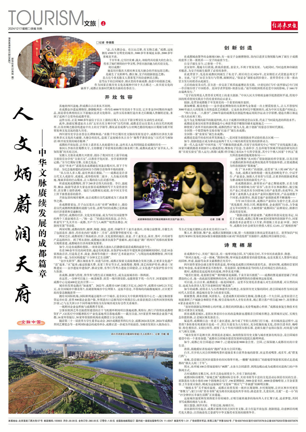 12月17日,新华社《经济参考报》以《人文炳蔚润天府——中华文脉赓续发展的成都篇章》为题,从开放包容、创新创造、诗意栖居三个方面,对成都以昂扬奋发之姿谱写中华文脉传承发展的锦绣华章进行了重点报道。
