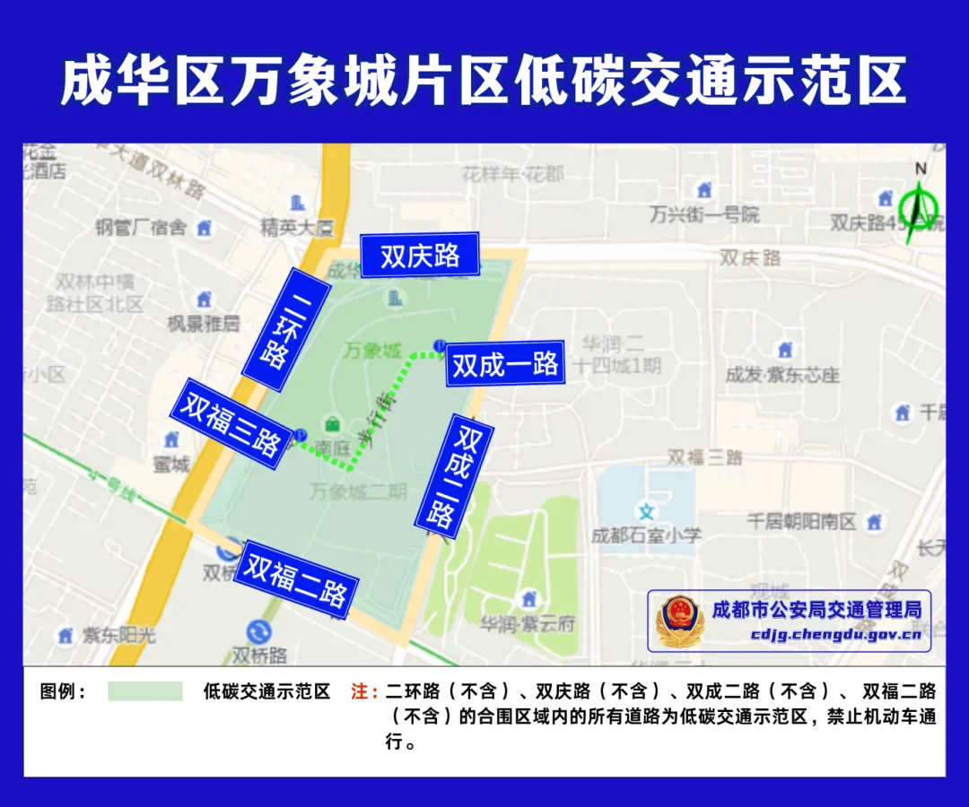 二环路(不含)、双庆路(不含)、双成二路(不含)、双福二路(不含)的合围区域内的所有道路,禁止机动车通行。