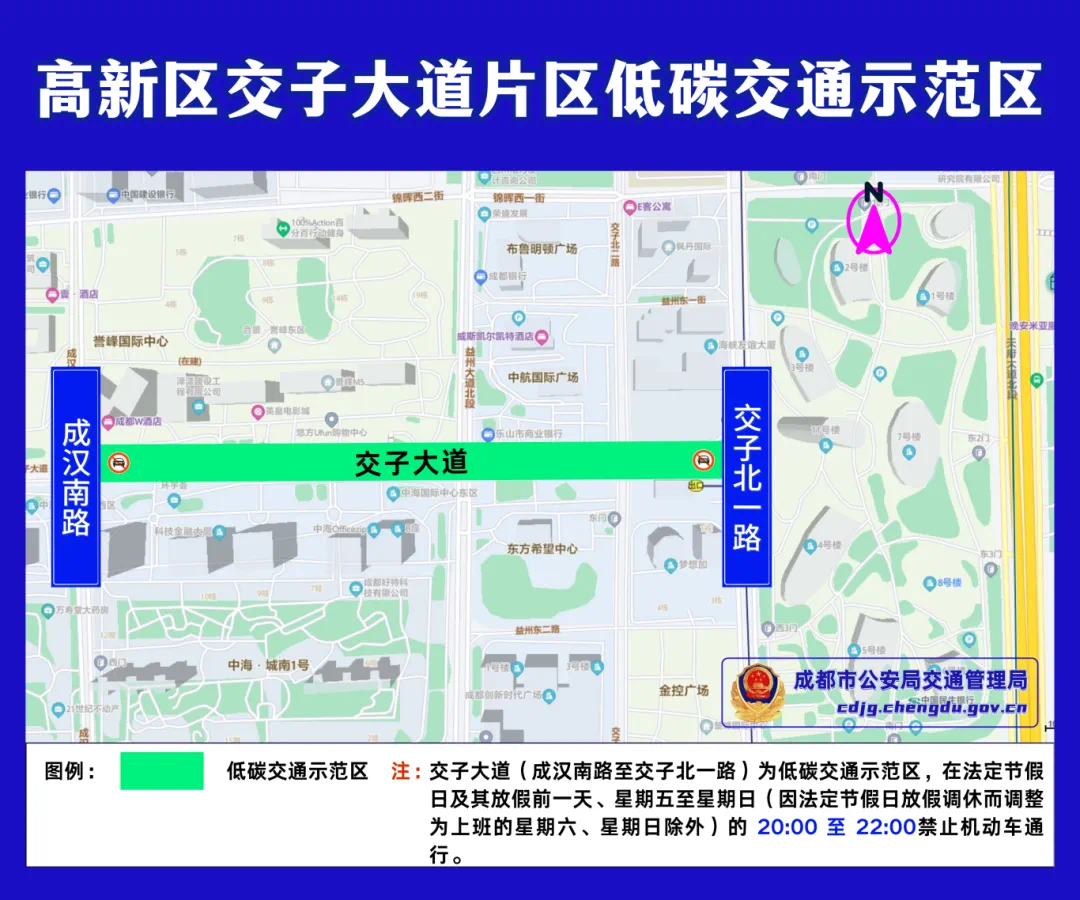 1.交子大道(成汉南路至交子北一路),在法定节假日及其放假前一天、星期五至星期日(因法定节假日放假调休而调整为上班的星期六、星期日除外)的 20:00 至 22:00禁止机动车通行。