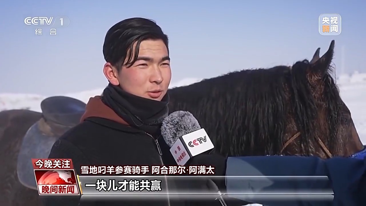 雪地叼羊参赛骑手 阿合那尔·阿满太:配合到位,团队协作,一块儿才能共赢。场上有进攻的,有防守的。首先动作要快,其次不能一直想着自己抢,要跟团队合作。