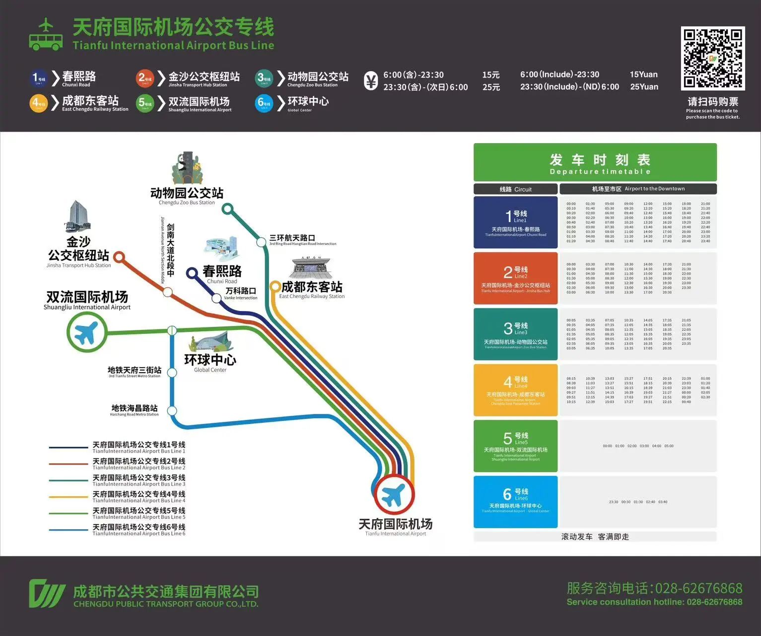 为助力成都市国际消费中心城市建设,营造良好营商环境,成都公交还在天府国际机场T1航站楼、T2航站楼、春熙路、金沙公交枢纽站、动物园公交站、成都东客站6座天府国际机场公交专线客服中心提供乘车咨询、休息候车、失物招领等24小时全天候专属服务,新增“航班信息显示屏”、升级双语服务标识及站内指引,开通“国际版AliPay”(支持境外银行卡绑定),支持VISA、MASTERCARD等消费功能的POS机,国内外旅客在客服中心实现便捷自助购票,也可使用成都公交APP或成都公交微信小程序、支付宝小程序购票(以上渠道均有中英文版本);同步推出“空巴联运”服务,选乘四川航空、南方航空、同程旅行的市民旅客,可在对应航空服务APP上免费预订、乘坐天府国际机场公交专线,在任意机场巴士乘车点凭二维码刷码乘车,实现地空“无缝换乘”。