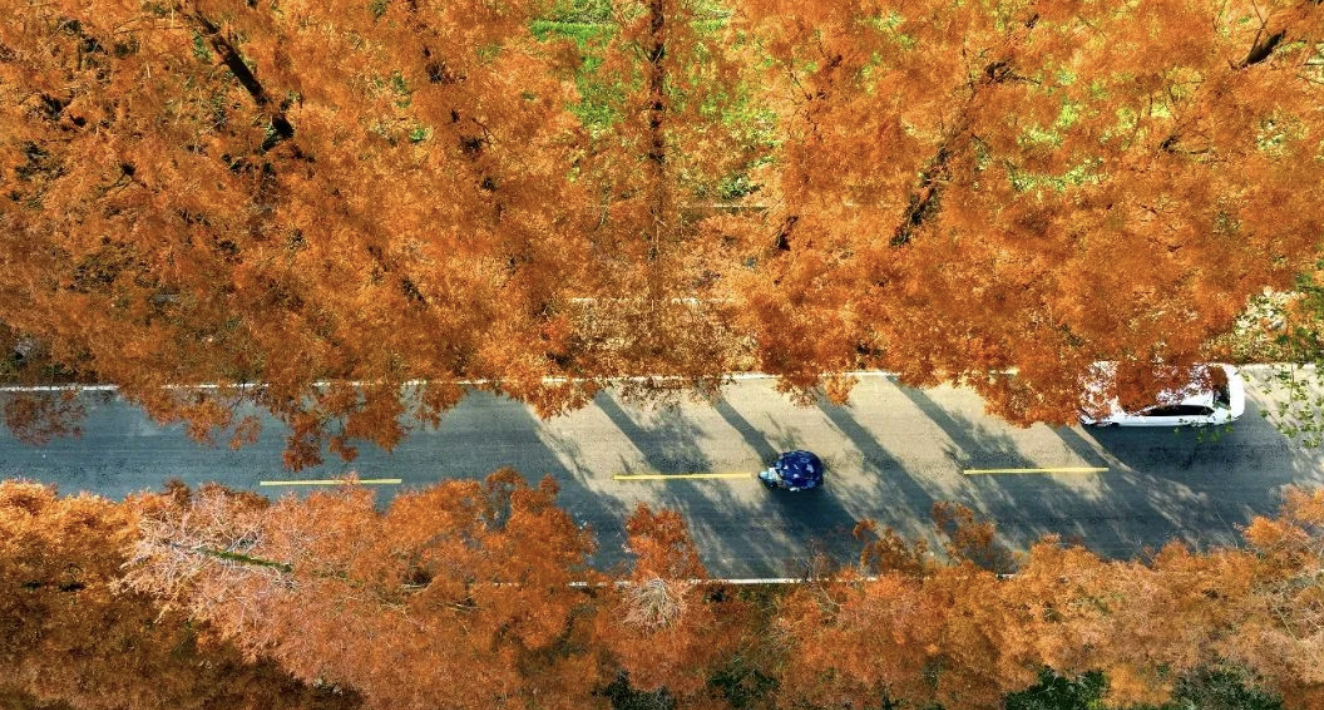 一排排水杉换上了冬日的“红妆”,挺拔而优雅,与纵横交错的田间小路相映成趣,勾勒出一幅幅让人心动的田园风光。(建议自驾前往)