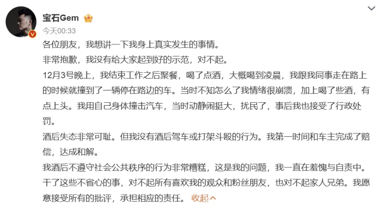 酒后失态!“宝石老舅”承认被行拘,“用身体撞击汽车,没打架”