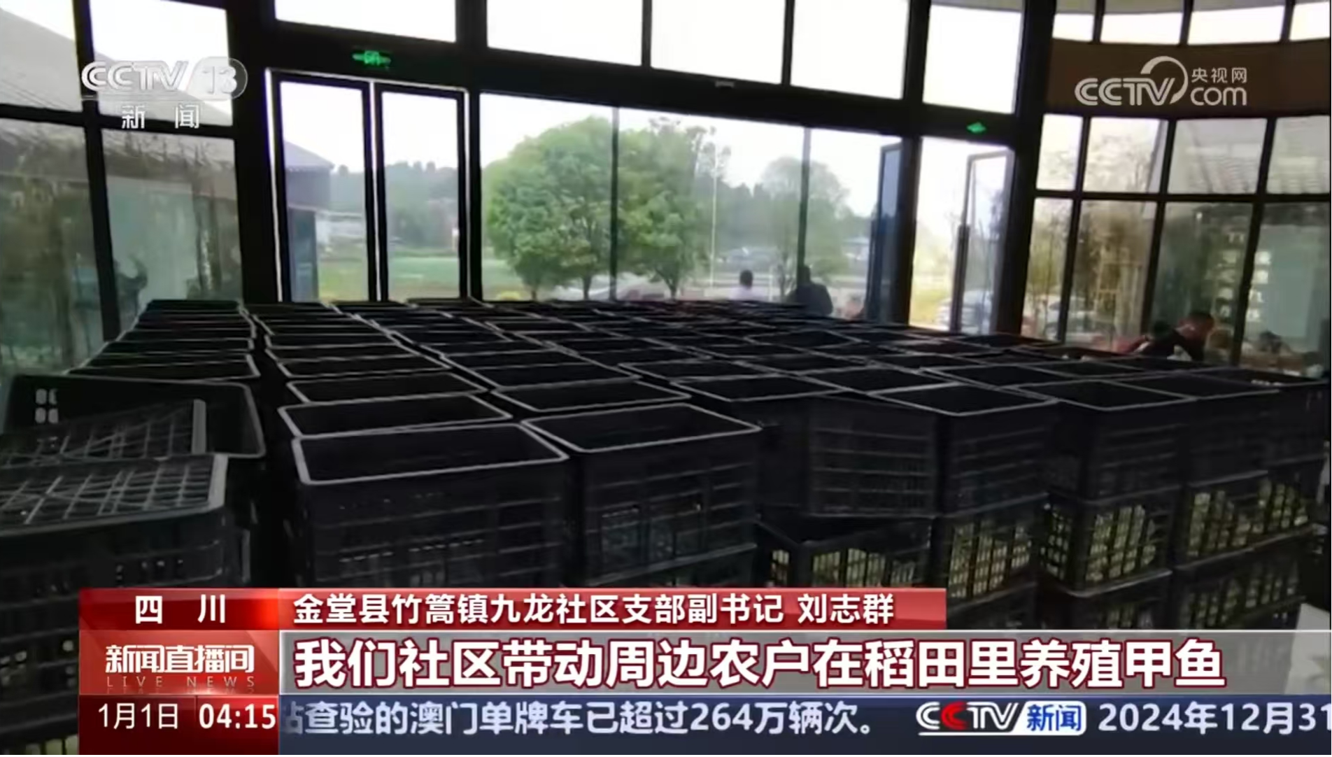 1月1日,央视《新闻直播间》播出《你好 2025 四川 元旦春节期间 土特产年货购销两旺》,其中报道成都金堂生态养殖甲鱼迎来节日热销,水稻养殖甲鱼的方式让居民收入得以增加。