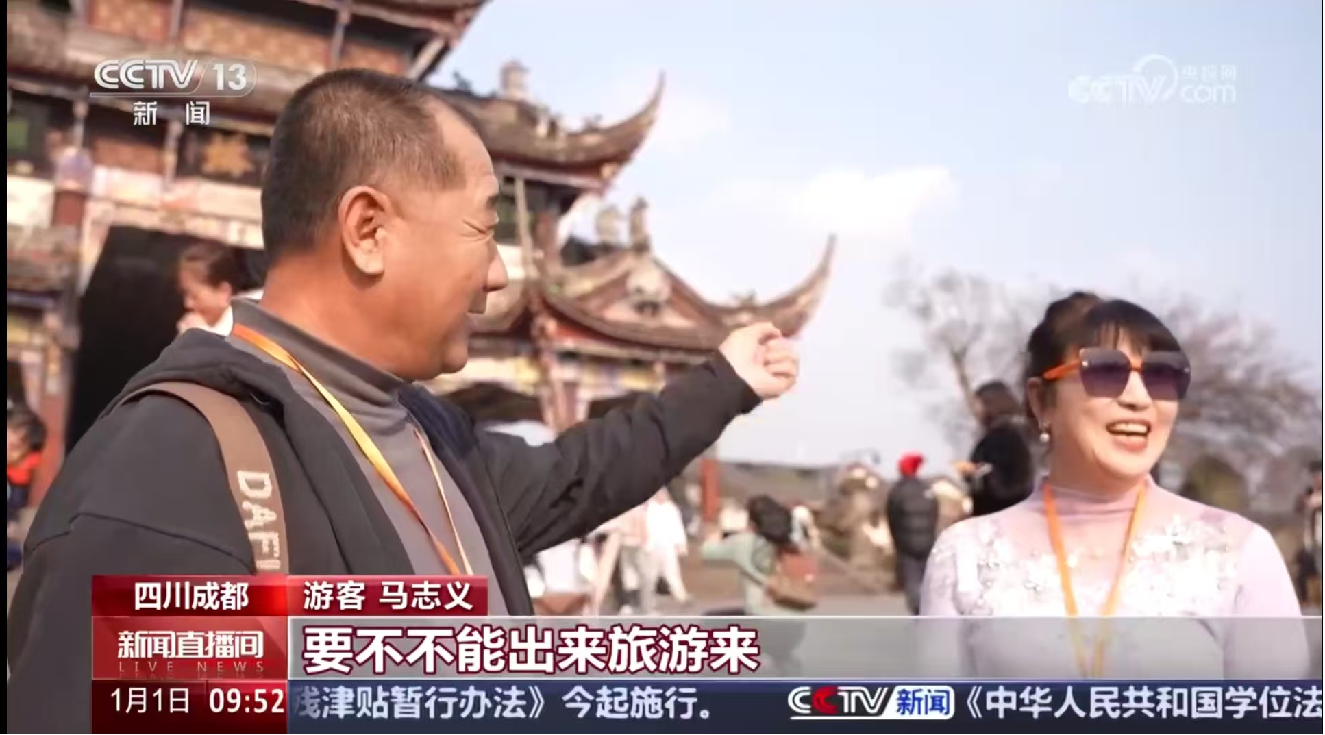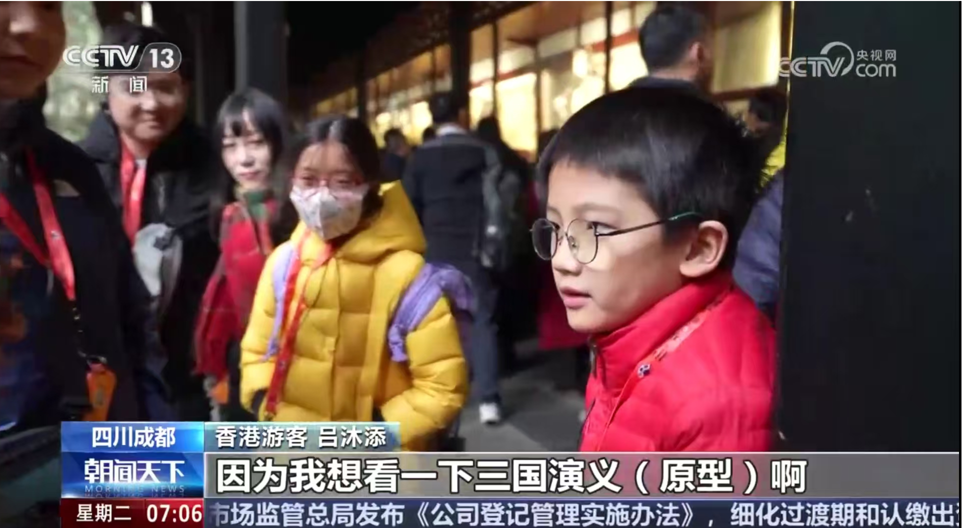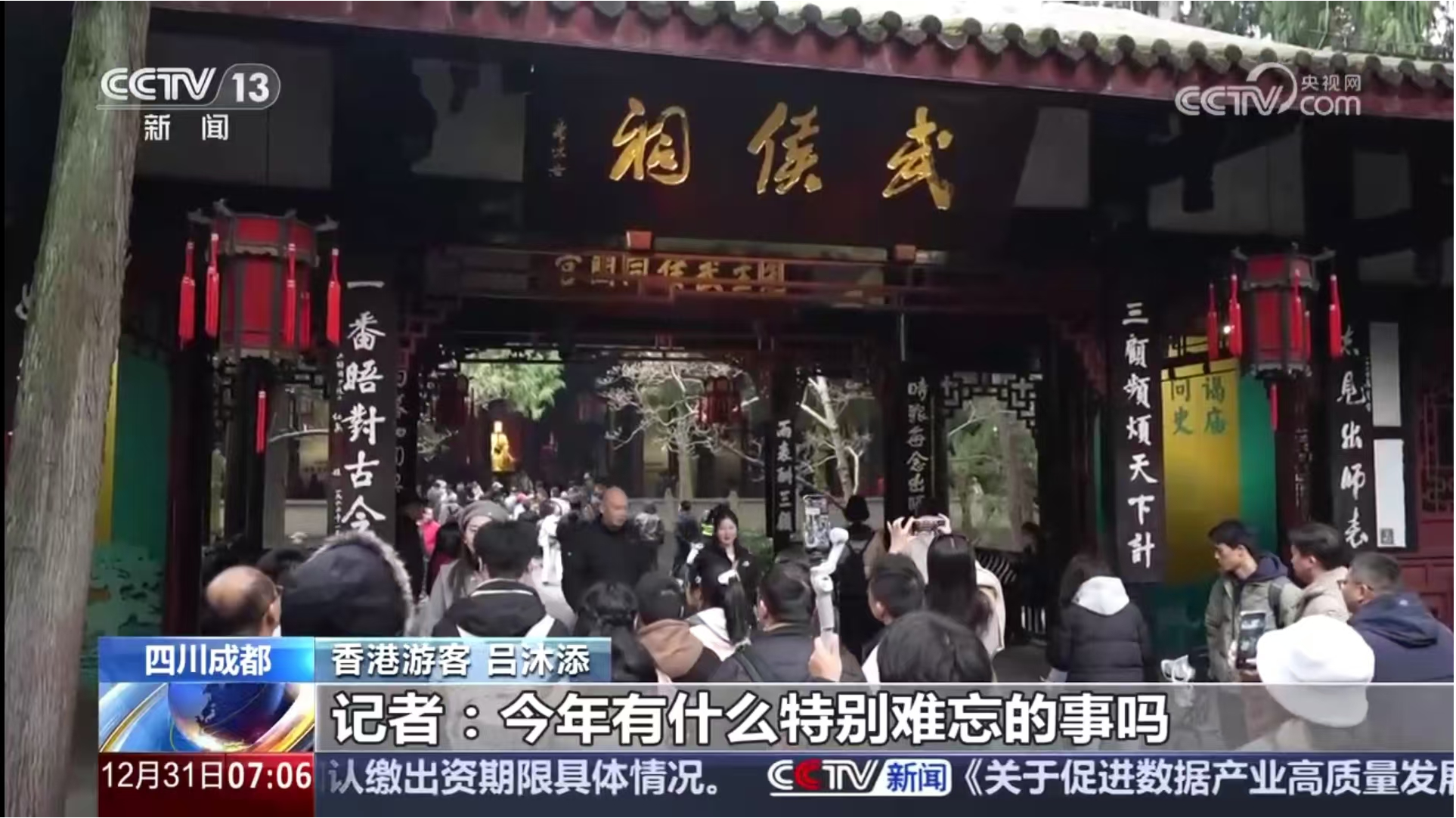 12月31日,央视《朝闻天下》播出《元旦海采 新年新愿:满满收获 共赴新年》,采访了在成都武侯祠旅游的香港游客。成都的蜀地文化、三国历史深深地吸引着前来参观的人们。