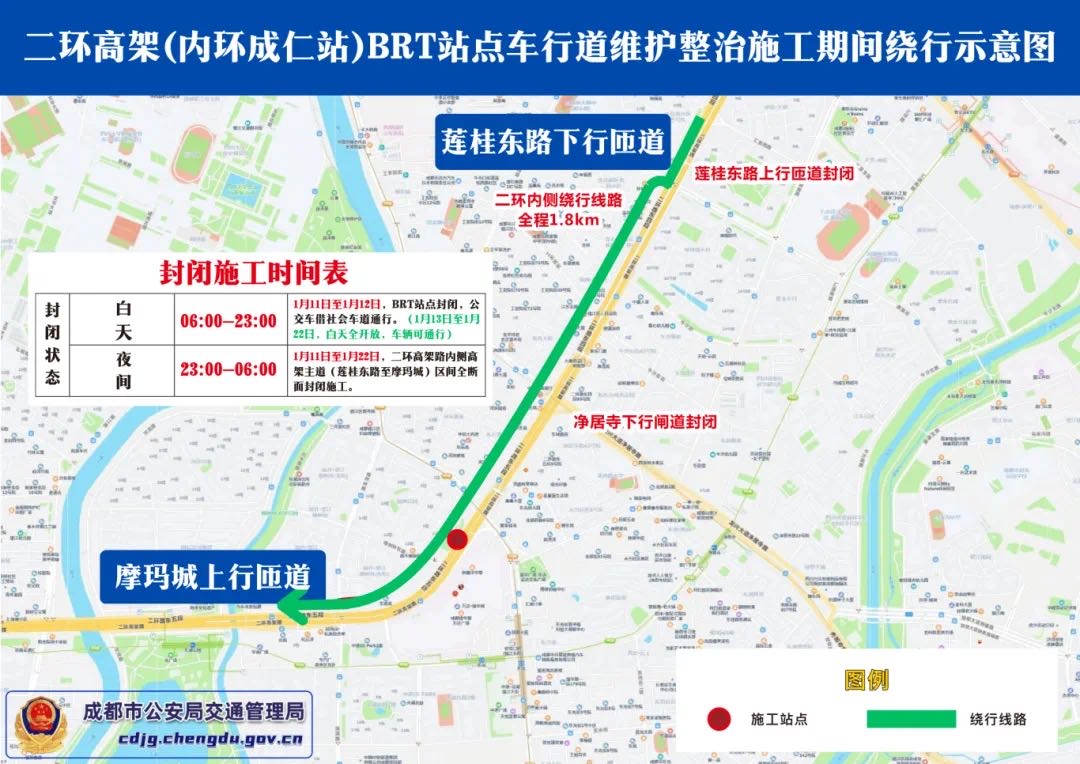 (一)2025年1月11日至1月12日,二环高架路内环成仁BRT公交站的快速公交车道封闭施工,公交车借高架路的社会车道通行。