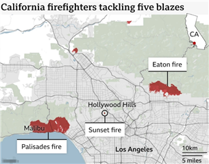 美国加州五场大火同时“点燃”洛杉矶 预估损失达500亿美元