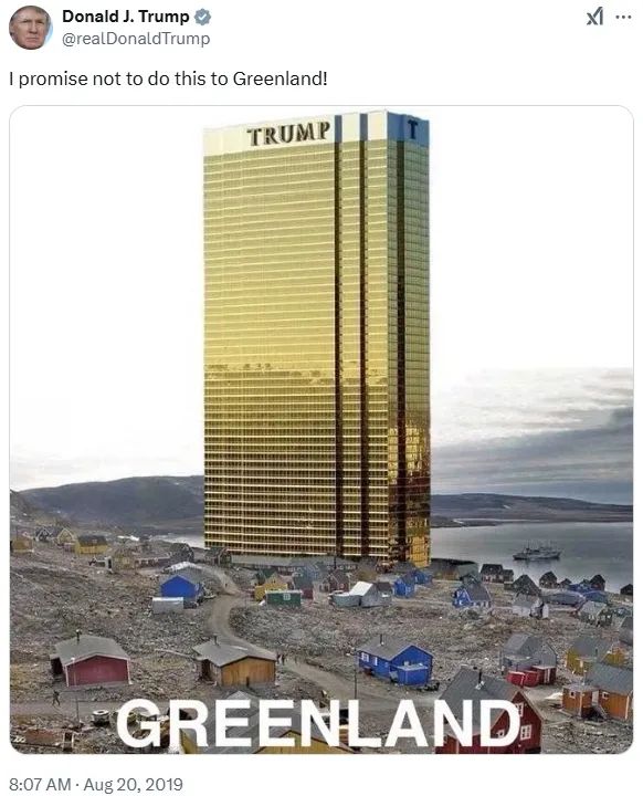 2019年,特朗普炒作“购买格陵兰岛”,并在推特上发文,声称保证不在格陵兰岛上建“特朗普大厦”。图片来源:特朗普推特截图