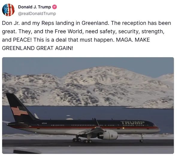 2025年1月7日,特朗普的长子小唐纳德·特朗普访问了格陵兰岛,特朗普在社交媒体上同步发文称:“小唐纳德和我的代表们已抵达格陵兰岛,受到了热情欢迎……(美国对格陵兰岛的控制)是一笔必须完成的交易。