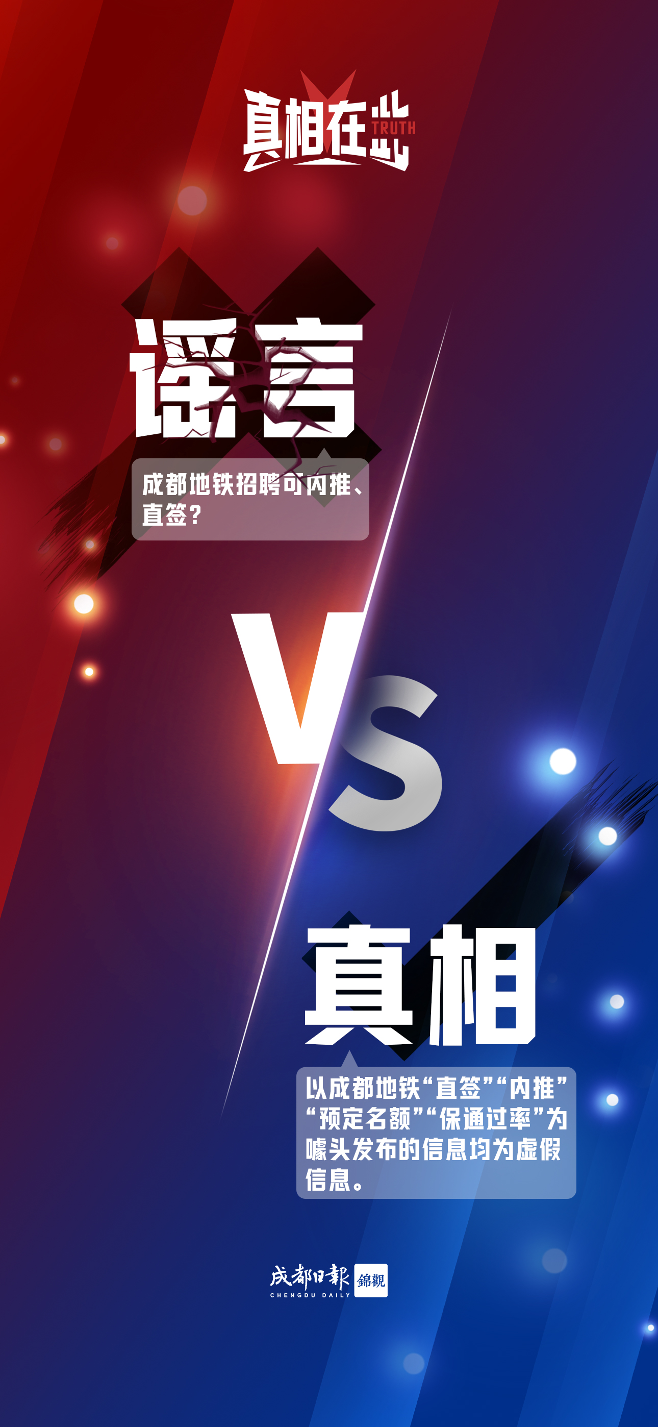 真相:不属实。成都轨道集团及下属单位未委托任何第三方机构或个人开展招聘招录工作。以成都地铁“直签”“内推”“预定名额”“保通过率”为噱头发布的信息均为虚假信息。