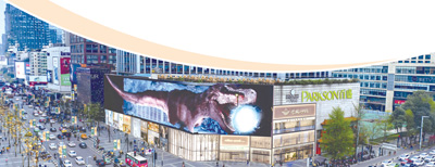 裸眼3D大屏上,熊猫嬉戏。忽然,熊猫爪子抓住屏框,仿佛即将走出屏幕……