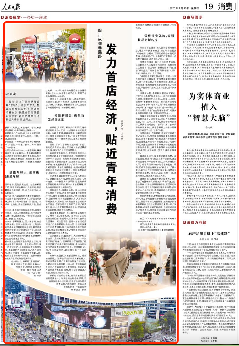 今日,人民日报以《四川成都春熙路——发力首店经济,贴近青年消费》为题,对春熙路商圈管理规范化、做优消费体验等高品质发展进行了报道。