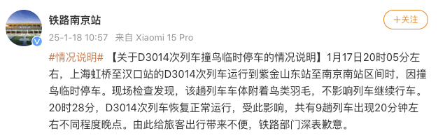 1月18日,@铁路南京站 发布情况说明,1月17日20时05分左右,上海虹桥至汉口站的D3014次列车运行到紫金山东站至南京南站区间时,因撞鸟临时停车。现场检查发现,该趟列车车体附着鸟类羽毛,不影响列车继续行车。20时28分,D3014次列车恢复正常运行,受此影响,共有9趟列车出现20分钟左右不同程度晚点。由此给旅客出行带来不便,铁路部门深表歉意。