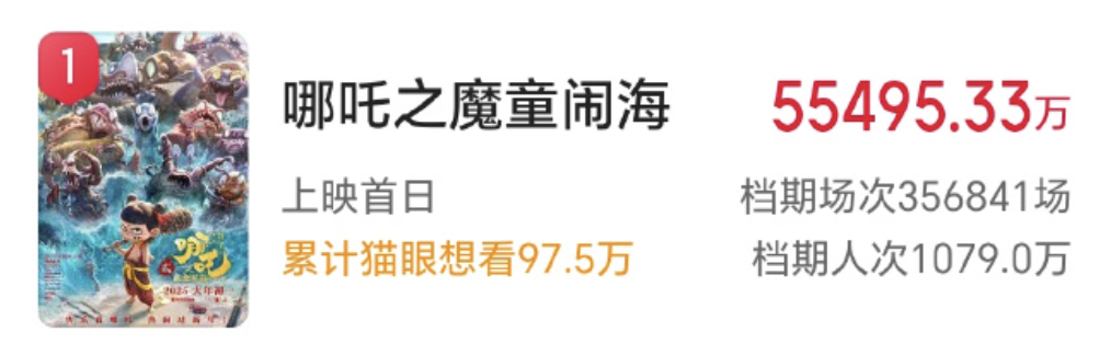 到2025年,《哪吒之魔童闹海》距离上一部足足有五年了。黑眼圈、厌世脸的魔童哪吒,“我命由我不由天”的金句,五年间鲜有出其右者,因此在它定档的那一刻,影迷的期待值就直接拉满,让票房“含金量”一路上扬。据灯塔专业版显示,预售首日,该片几乎稳居票房榜第二名,斩获3000万票房。截至大年初一正式开画前,《哪吒2》已提前锁定了2.5亿预售票房,为初一日票房冲到5亿奠定了坚实基础。
