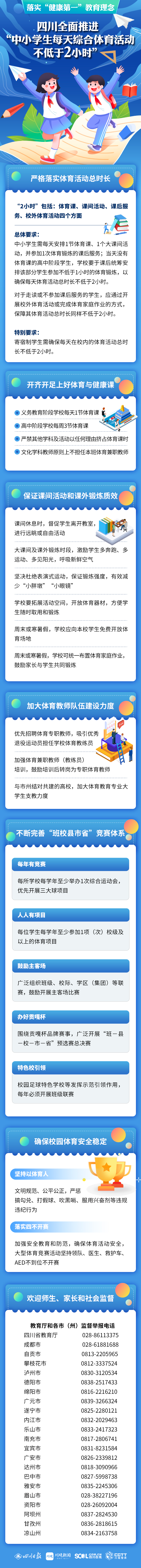 为落实《教育强国建设规划纲要(2024—2035年)》和“健康第一”的教育理念,日前,四川省教育厅印发了《关于确保中小学生每天综合体育活动时间不低于两小时的通知》。通知要求,2025年春季学期开学后,我省将全面实施“中小学生每天综合体育活动时间不低于2小时”,并接受师生、家长和社会的监督。教育厅和各市(州)教育主管部门设立的监督举报电话也一并向社会公布。