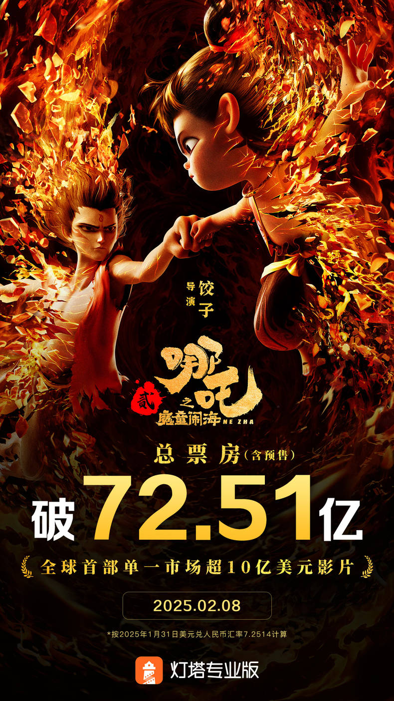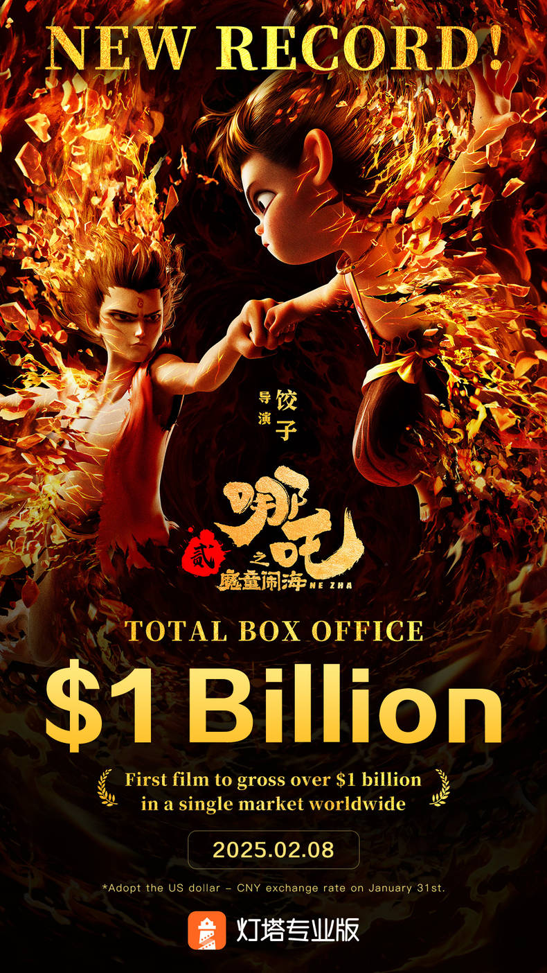 《哪吒之魔童闹海》成为全球首部单一市场票房超10亿美元影片