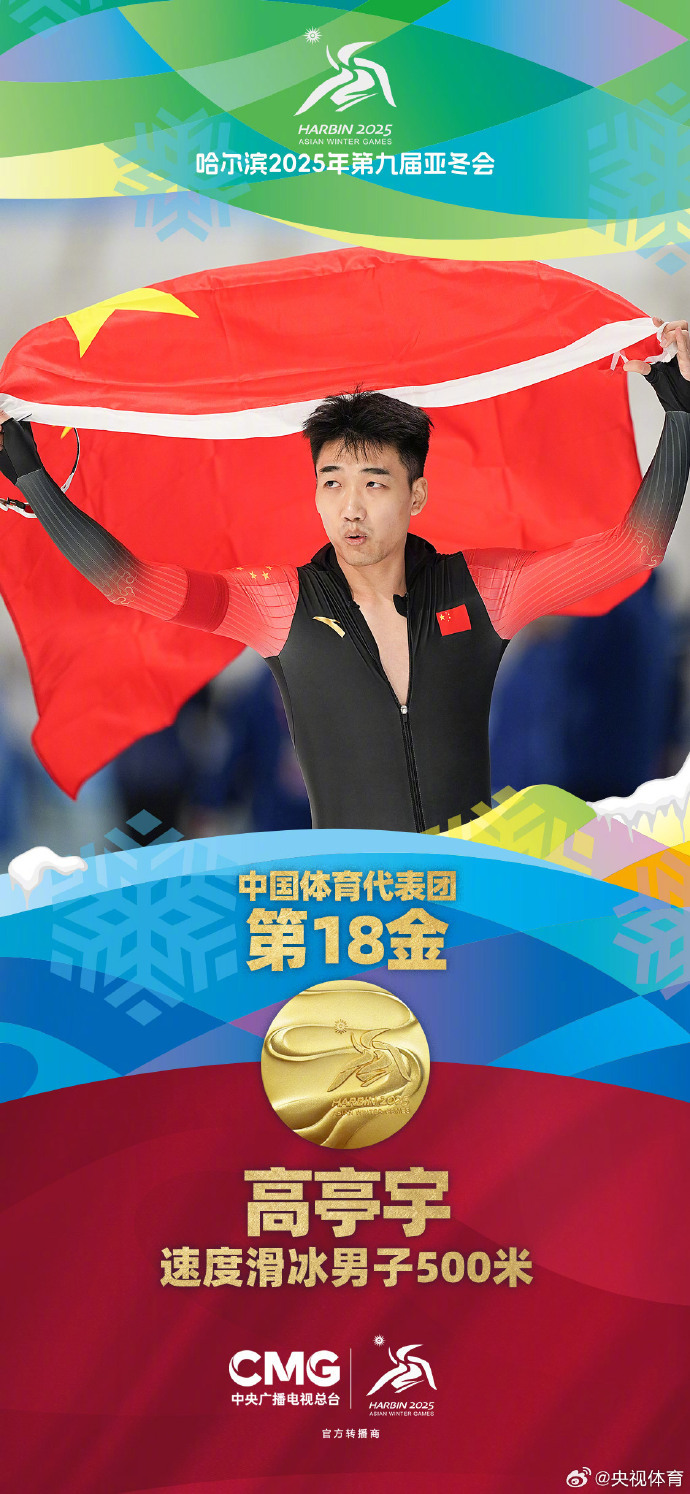 第18金!高亭宇夺得亚冬会速度滑冰男子500米金牌