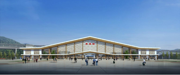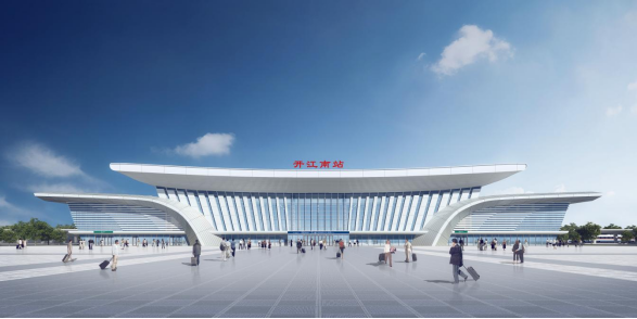 开江南站建筑规模8000平方米,2台4线。开江是秦巴地区东向经济走廊出口,是四川东部重要的交通枢纽和门户城市。开者,张也,面向未来,张开怀抱,建筑屋顶提取开江的“开”字文化,双层飞翘的屋檐和挺拔的立柱抽象组成“开”字笔法,表达开江独特的区位特点和开放包容的城市文化,同时也是对开江开阔、开放、开创、开畅等城市性格的展现。