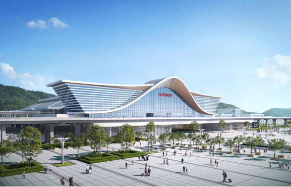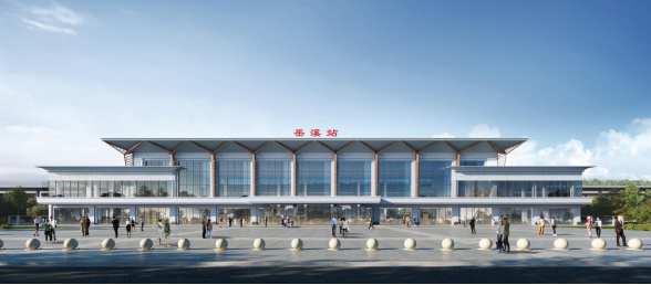 岳溪站建筑规模6000平方米,2台4线,建筑造型整体呈现对称性,与当地文化、环境、风俗、地貌相和谐,山形起伏的屋盖配以硬线条的基座,展现出舒展恢宏的建筑形态。