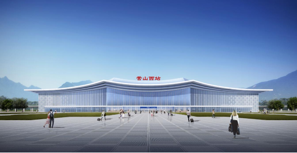 营山西站建筑规模12000平方米,2台4线,站房造型灵感来源于川东的自然山形地貌和蓬安营山两地相向发展的态势,站房吸取地域特色和传统文化,以现代的材料和手法进行重构,以山云相连的态势回应当地文化。站房立面竖向线条如山云画卷由中间向两侧徐徐展开,辐射营山蓬安两地,携于发展,共织锦绣。