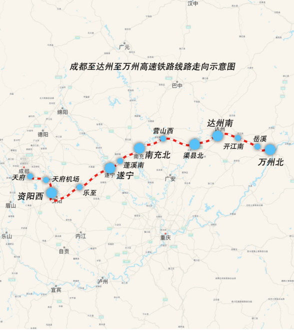 据了解,成达万高铁全线设车站13座,其中,新建乐至、蓬溪南、营山西、渠县北、达州南、开江南、岳溪7座车站;利用成都至自贡至宜宾高铁车站3座(天府、天府机场、资阳西);引入既有站3座(遂宁、南充北、万州北)。