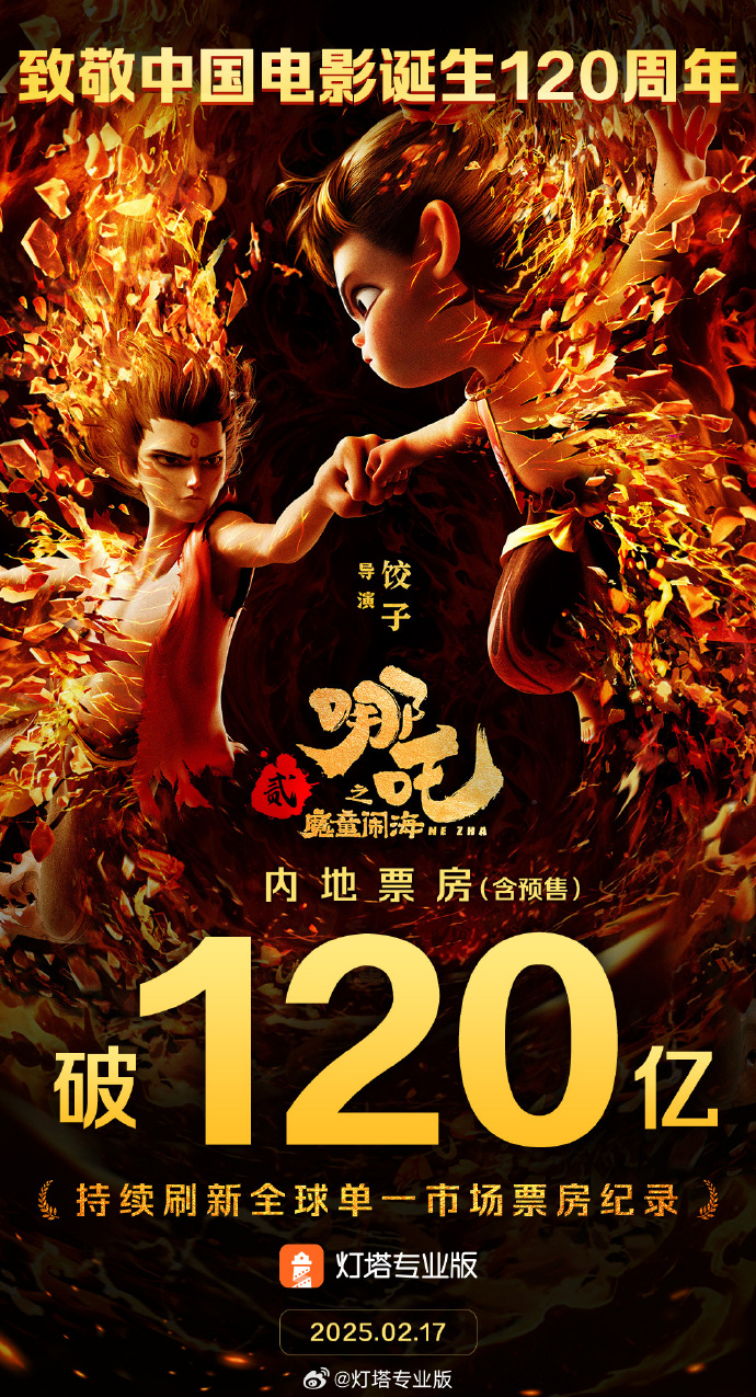 据灯塔专业版,截至2月17日16时41分,影片《哪吒之魔童闹海》内地单一市场票房(含预售)突破120亿,持续刷新全球单一市场票房纪录!