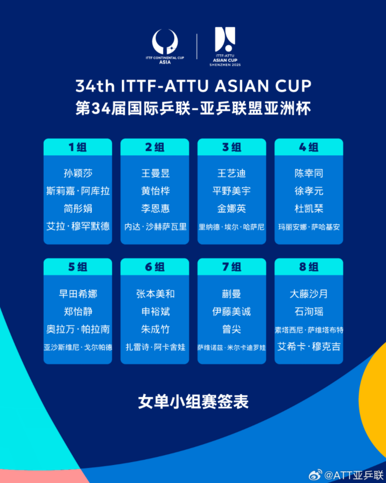 孙颖莎首轮与阿库拉同组,王曼昱、王艺迪等所在的女单小组赛签表如下↓