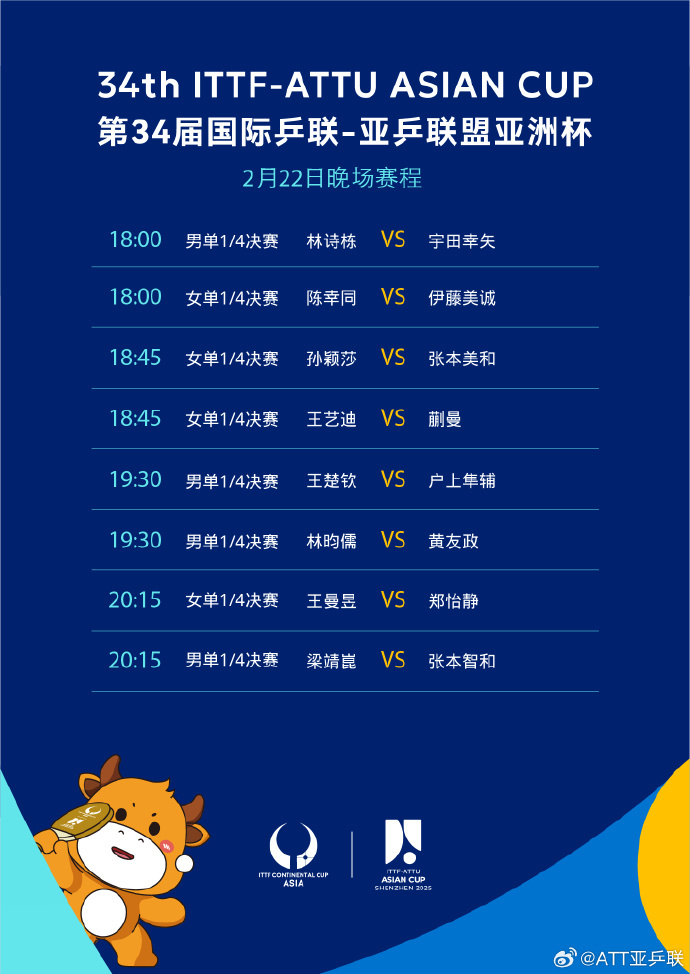 2月22日晚,2025年乒乓球亚洲杯在深圳继续进行。根据赛程,今天18点起将同步进行男单1/4决赛和女单1/4决赛,具体有哪些安排呢?