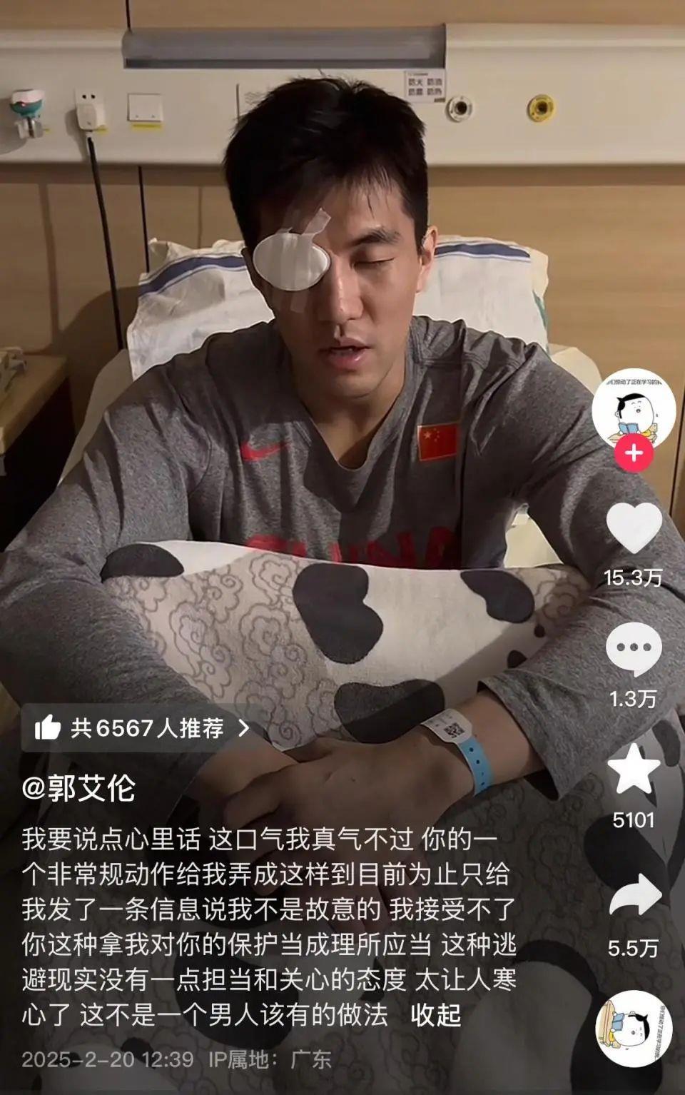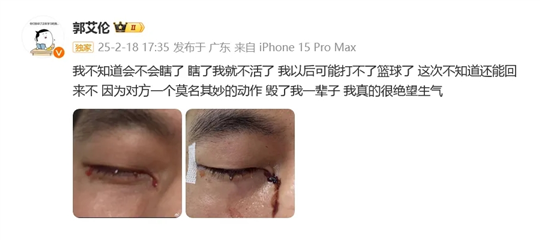 根据俱乐部的通报,周一,球队的队内对抗训练中发生意外,郭艾伦右眼不幸受伤。目前他已完成手术,进入恢复阶段。周二,郭艾伦在社交媒体上表示,自己是在训练中被对方手指戳中了眼睛,导致结膜破碎,缝了40多针。眼科医生、北京朝阳医院主任医师陶勇表示:结膜受伤经过处理后大概率会恢复得不错,不用太担心。