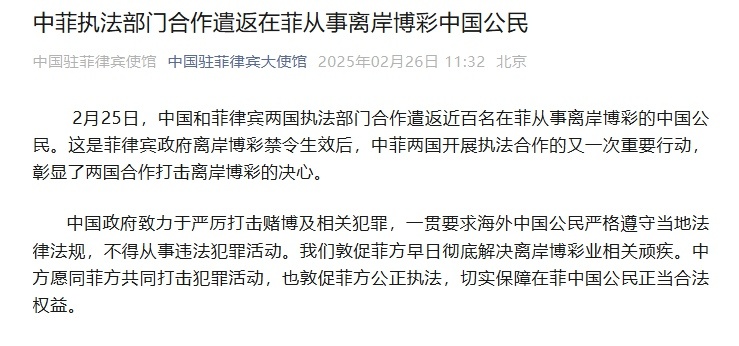中国驻菲律宾大使馆消息,2月25日,中国和菲律宾两国执法部门合作遣返近百名在菲从事离岸博彩的中国公民。这是菲律宾政府离岸博彩禁令生效后,中菲两国开展执法合作的又一次重要行动,彰显了两国合作打击离岸博彩的决心。