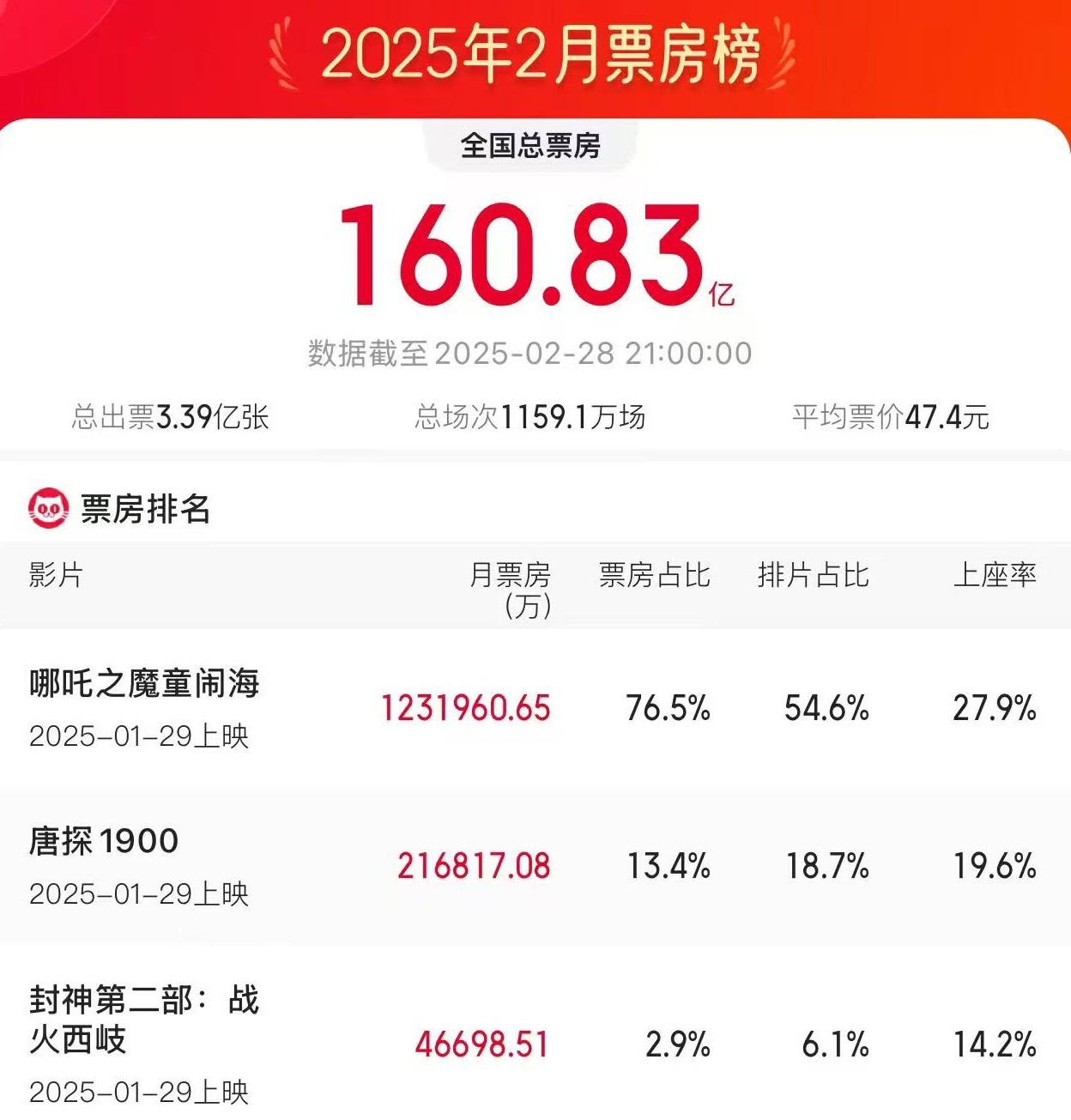据网络平台数据,截至2月28日21时,2025年2月总票房160.83亿,刷新中国影史单月大盘票房、人次纪录,其中《哪吒之魔童闹海》2月票房超123.19亿,《唐探1900》《封神第二部:战火西岐》分列2月票房榜二三位。