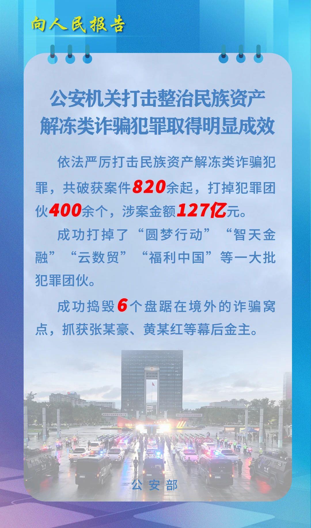 2024年,按照公安部部署要求,全国公安机关深入推进打击整治民族资产解冻类诈骗犯罪专项行动,依法严厉打击此类诈骗犯罪,共破获案件820余起,打掉犯罪团伙400余个,涉案金额127亿元,取得明显成效。