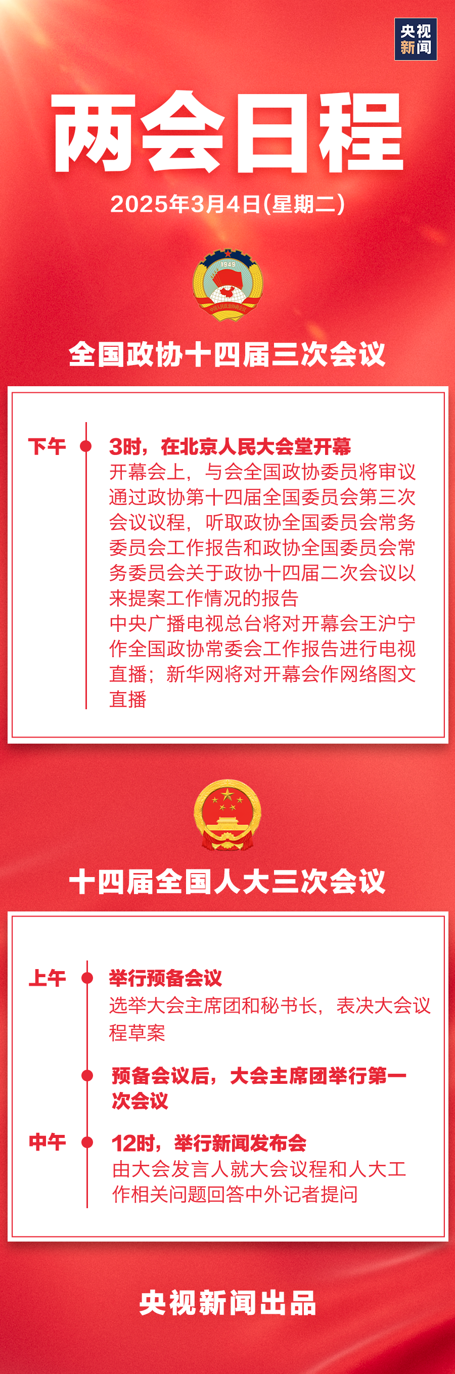 两会日程预告丨3月4日:全国政协十四届三次会议下午3时开幕 十四届全国人大三次会议举行预备会议