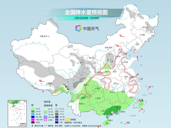 预计今明两天,南方大部仍将沉浸在阴雨之中,局地还将伴有短时强降水、雷暴大风等强对流天气。同时,西藏东部、青海大部、川西高原、甘肃大部等地还将有小到中雪或雨雪混杂天气。
