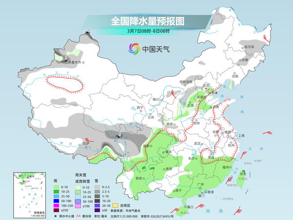 具体来看,中央气象台预计,今天西藏北部和东部、青海东部、川西高原、甘肃西部和南部、宁夏、陕西中部和南部、山西、内蒙古东北部、黑龙江西部和东南部等地部分地区有小雪或雨夹雪,其中,西藏东部、川西高原、山西北部等地部分地区有中到大雪。西南地区大部、江南南部和西部、华南、台湾岛等地部分地区有小到中雨,其中,广东西南部的部分地区有大雨。