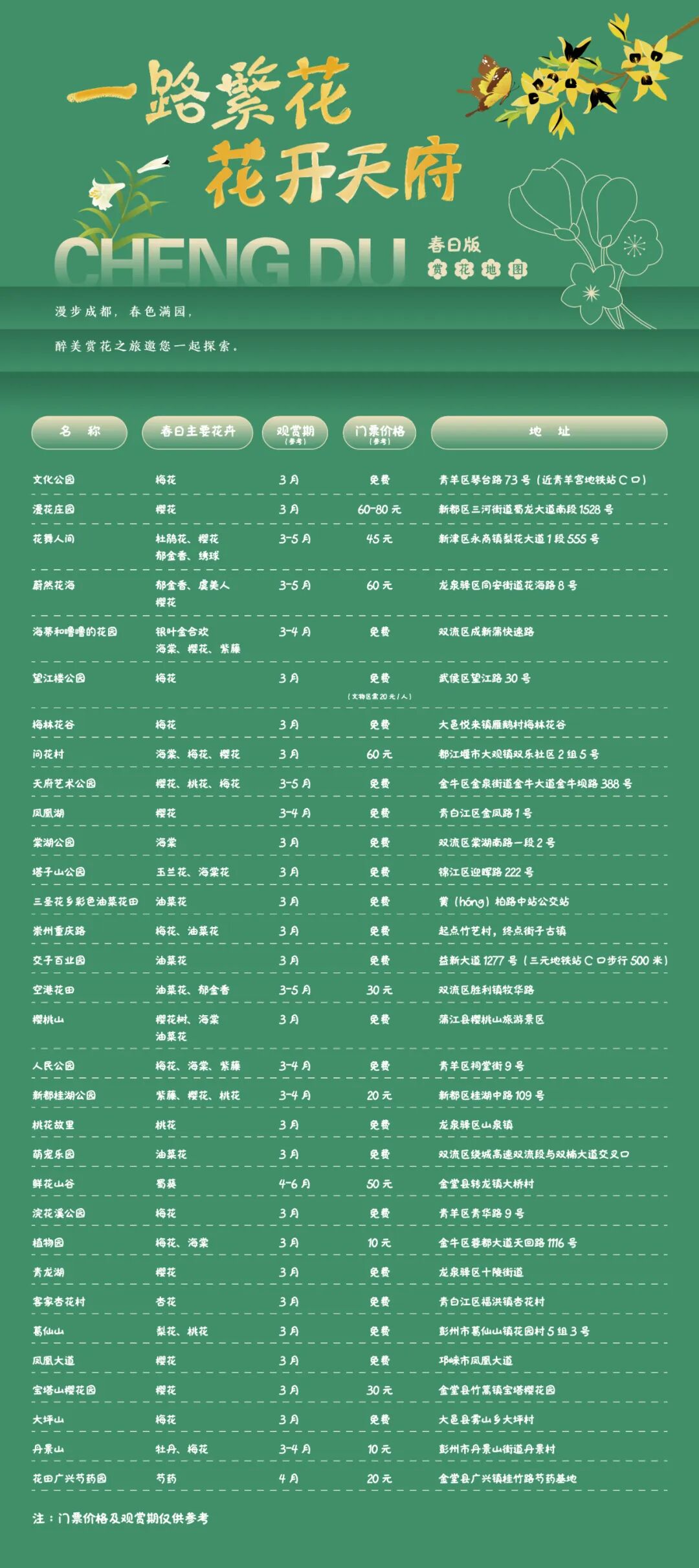随着春回大地,天府之国的千里沃野重新绿意葱茏、繁花盛开。无论乡野村落,还是市井街巷,各色鲜花次第盛开,“花重锦官城”的盛况如期而来。为方便市民群众赏花出游,市公园城市局制定了『2025公园城市赏花地图春日版』,今日正式发布!
