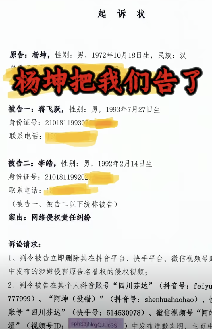 3月10日,博主“四川芬达”发视频称被明星杨坤起诉。通过其展示的北京互联网法院传票和起诉状可以看到,该案的案由是网络侵权责任纠纷,原告杨坤的诉讼请求第一条为,判令被告立即删除其在各大短视频平台账号中发布的涉嫌侵害原告名誉权的侵权视频。此外,原告还有发布道歉视频和赔偿精神损失费的诉求。