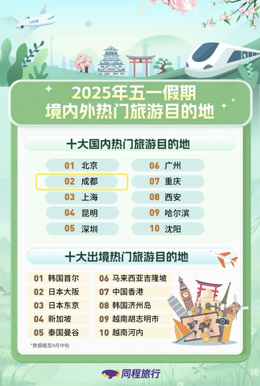 同程发布“五一”假期报告 成都位列国内热门旅游目的地前三