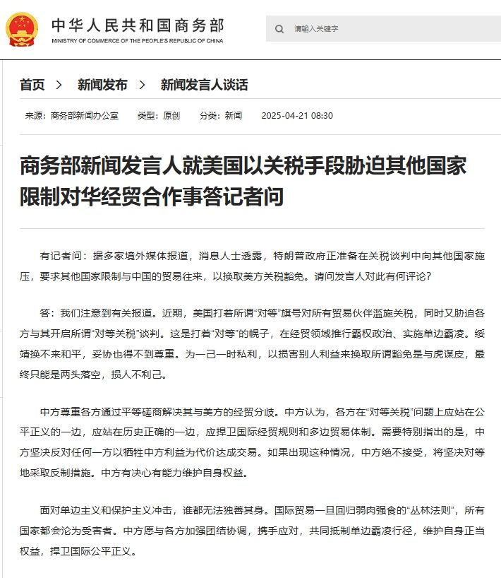商务部新闻发言人就美国以关税手段胁迫其他国家限制对华经贸合作事答记者问