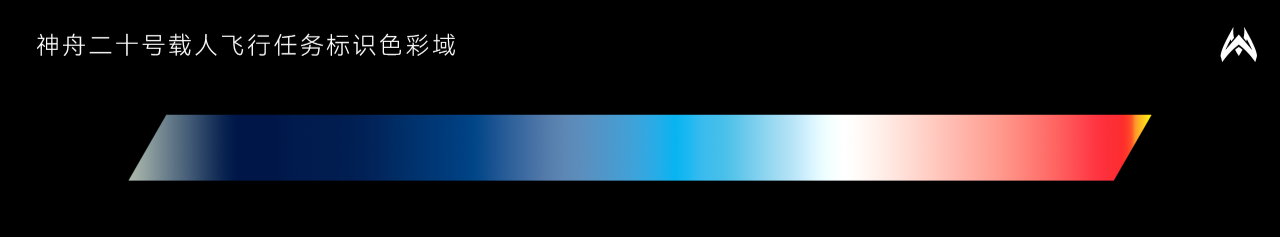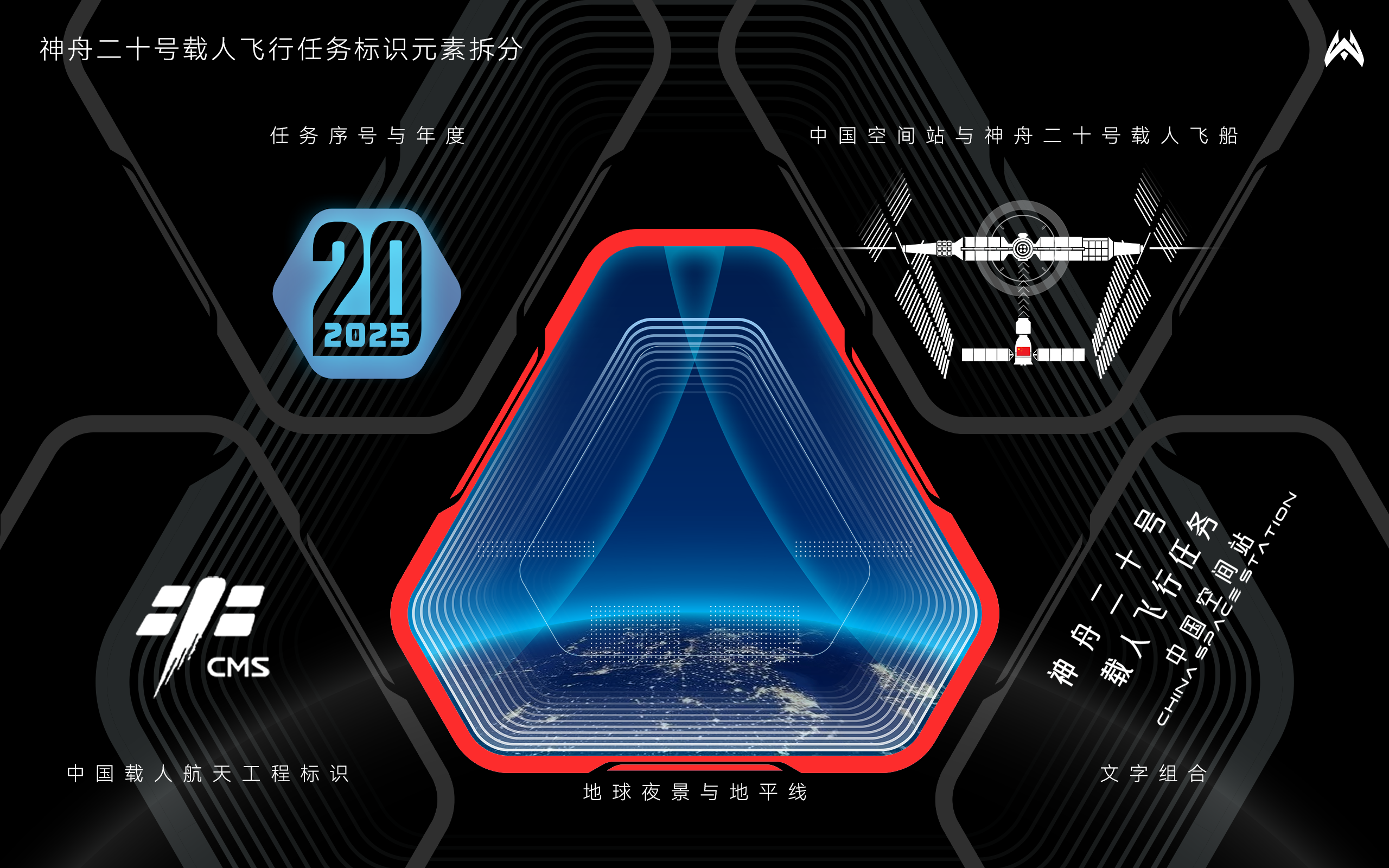 标识的主要元素由地球、中国空间站以及神舟二十号载人飞船组成,以“精准”“纵深”与“聚焦”作为设计主题将这些元素通过大透视及渐变重新构成,整体呈现更强烈的视觉层次,模拟一种通过舷窗望向外部空间的视觉感受。